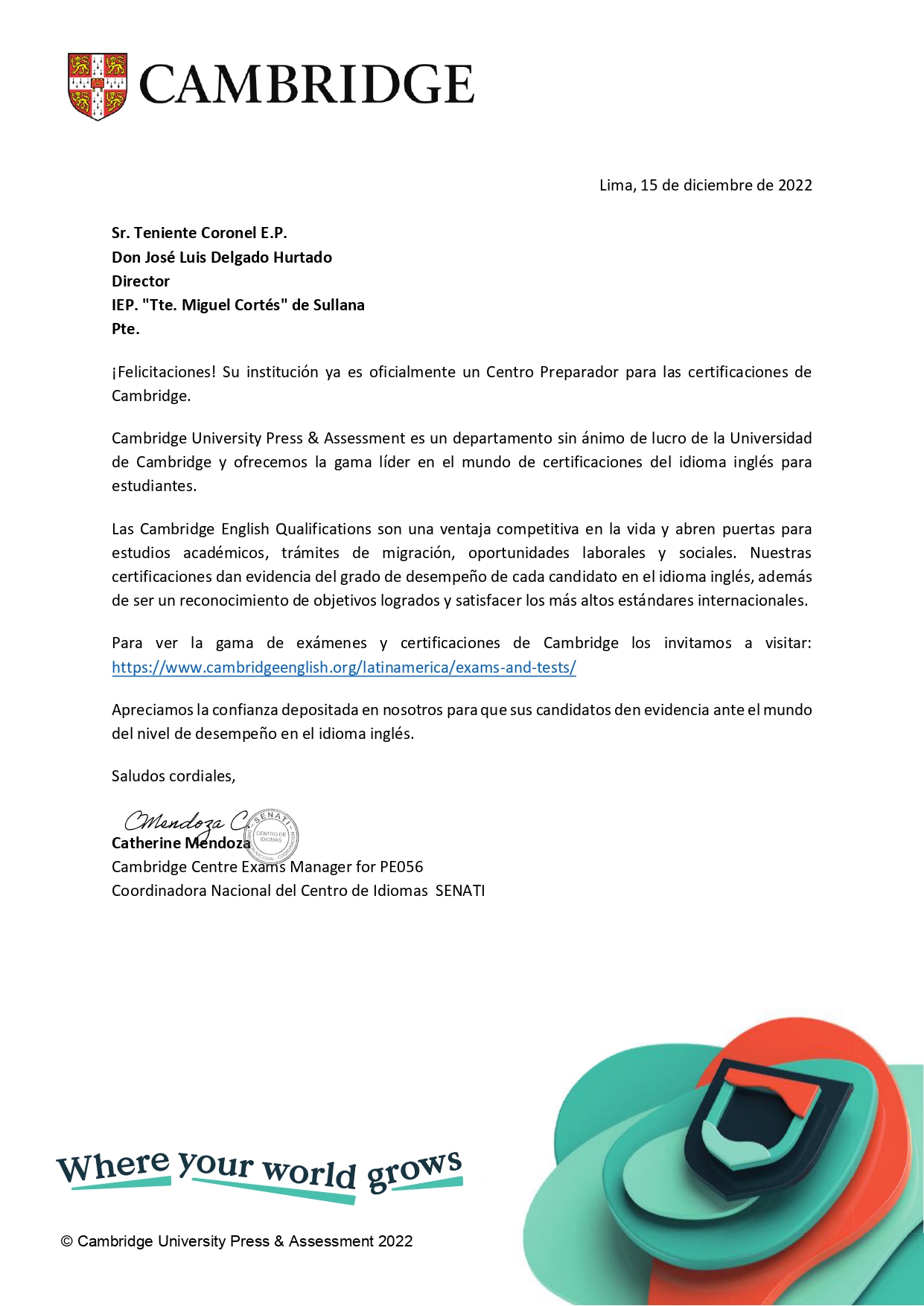 La Institución Educativa Privada "Tte. Miguel Cortés" es ampliamente reconocida como centro preparador de exámenes internacionales de Cambridge. Este prestigio refleja su compromiso con la excelencia educativa, garantizando a los estudiantes una formación sólida en el idioma inglés. Ofrece preparación para certificaciones como Starters, Movers, Flyers, KET y PET, las cuales son valoradas a nivel global. Esto les permite a los alumnos alcanzar competencias lingüísticas avanzadas y competitivas. Además, su enfoque pedagógico integra recursos tecnológicos y metodologías actualizadas que potencian el aprendizaje. Esta distinción posiciona a la institución como un referente en la enseñanza del inglés en la región.