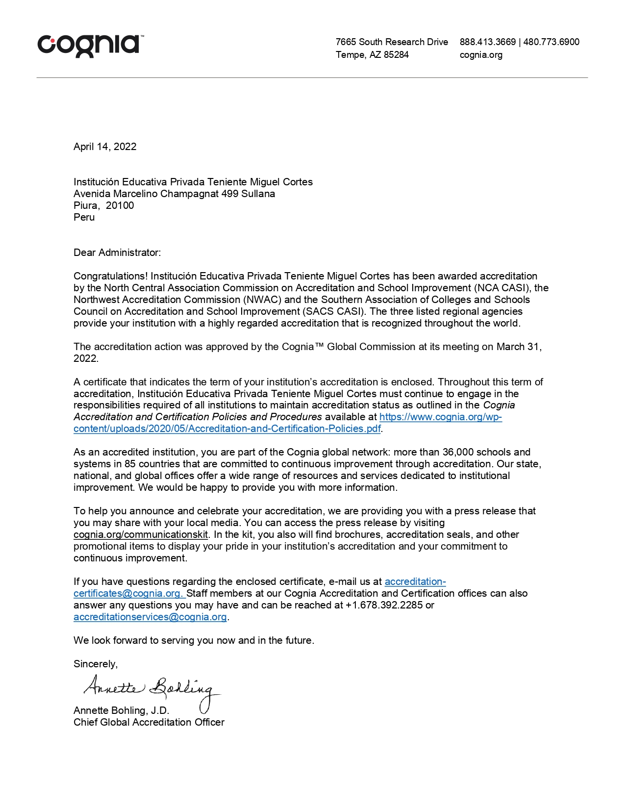 Cognia® es la institución acreditadora más grande del mundo, dedicada a impulsar y mejorar las oportunidades educativas para todos los estudiantes. Obtener esta certificación es un reconocimiento al compromiso de ser una institución educativa visionaria, orientada hacia la calidad y la excelencia en todos sus procesos.